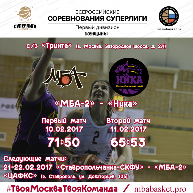 Сегодня в "Тринте" баскетболистки "МБА-2" провели свою заключительную домашнюю игру регулярного чемпионата Суперлиги-1. Как и накануне нашим соперником стала "Ника" из города Сыктывкар. Вчера наши девчонки уверенно выиграли 71:50, но это не обещало легкой жизни сегодня, ведь соперник был настроен взять реванш.