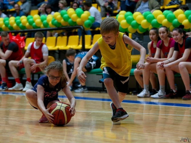 Разминка, упражнения, конкурсы эстафеты и, конечно, такая долгожданная двухсторонка с профессиональными баскетболистами. У малышей от счастья светились глаза, а завершилось все совместным фото и подарками от клуба.
